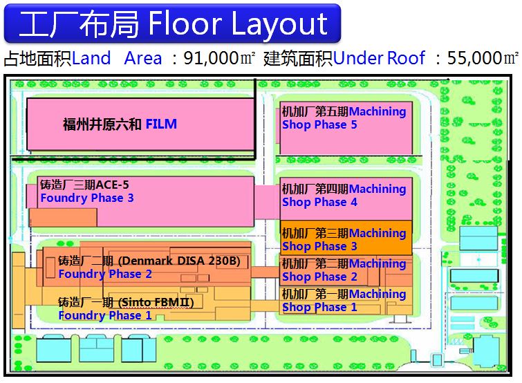 | 1.鑄造廠(chǎng): 主要材質(zhì):灰口鑄鐵&球墨鑄鐵(FC150-FCD700部品、高硅高鉬等部品) 造模產(chǎn)線(xiàn):3條(FBM&DISA&ACE) 產(chǎn)能合計(jì)5,100噸/月。熔解爐(中頻電爐):3T-8支/5T-4支 砂模尺寸:900*800*230-260(ACE-5),535*650*X(DISA,X指可調(diào)),420*520*150-180(FBM-II) 鑄件重量:0.2Kg-30Kg(Max:70Kg) |